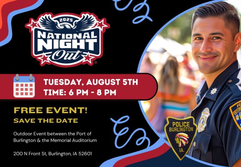 Party with a Purpose! National Night Out is COMING! TUESDAY, AUGUST 5TH, from 6 PM - 8 PM, celebrate National Night Out! Head down to the riverfront, right between the Port of Burlington & the Memorial Auditorium (200 N Front St, Burlington, IA 52601)!